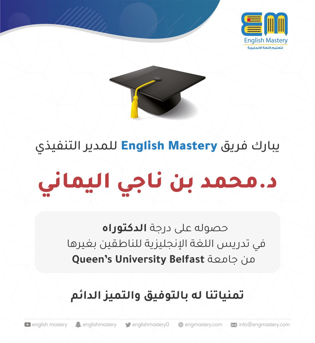 English Mastery On Twitter نبارك للمدير التنفيذي د محمد بن ناجي اليماني حصوله على درجة الدكتوراه في تدريس اللغة الإنجليزية للناطقين بغيرها من جامعة كوين بلفاست البريطانية ألف مبروك د محمد تمنياتنا
